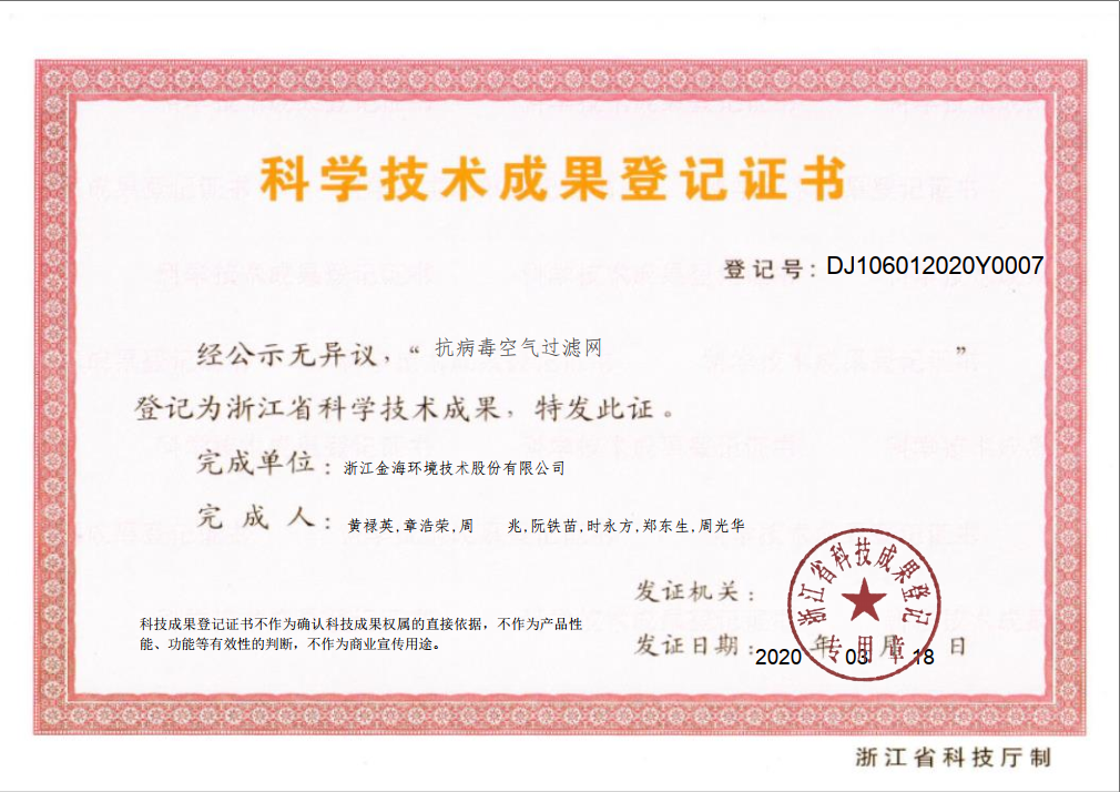 • 抗病毒空气过滤网科学技术成果登记证书