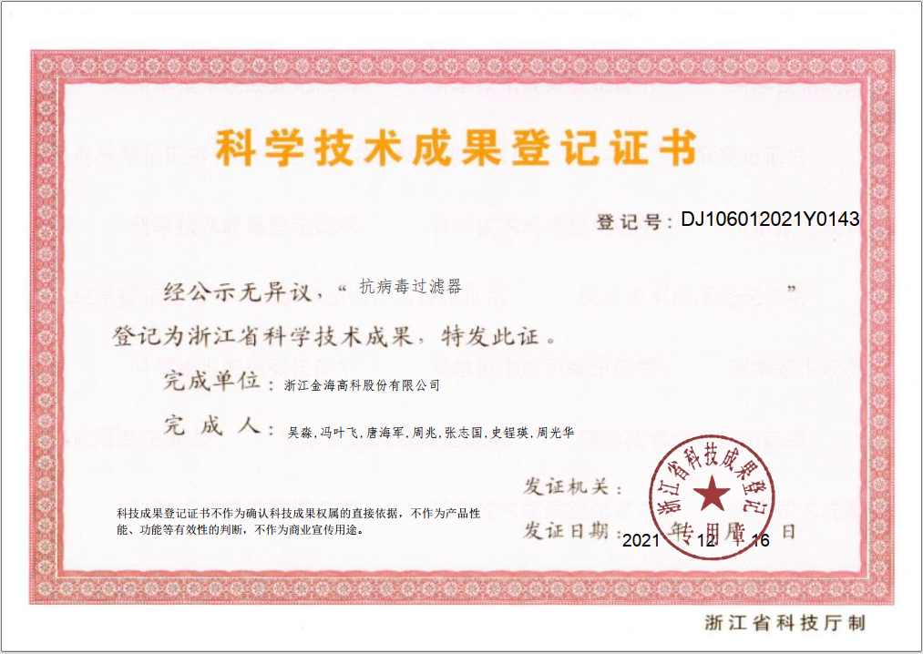 • 抗病毒过滤器科学技术成果登记证书
